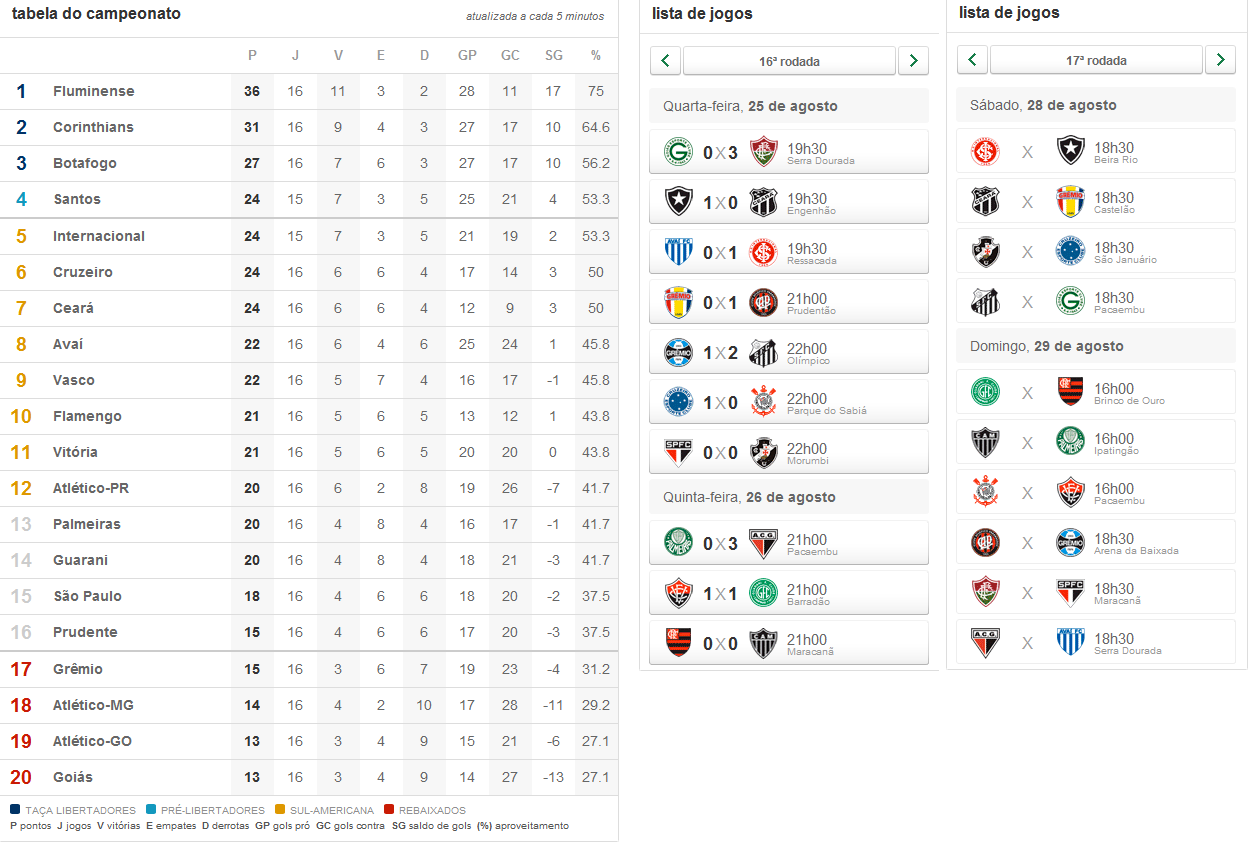 With yesterday’s result, Palmeiras dropped from 12th to 13th position, with a total of 20 points in 16 games (click thumbnail for full table and next round of games). This coming Sunday, Palmeiras heads to Belo Horizonte to face another bottom dwelling team, Atlético-MG, led by former Palmeiras and Real Madrid coach Vanderley Luxemburgo.