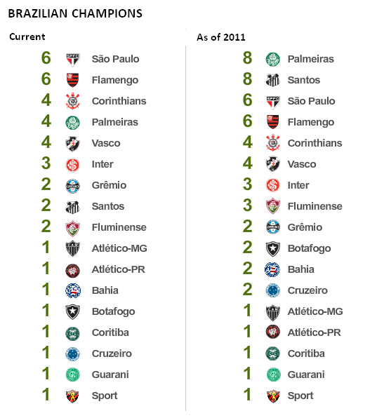Palmeiras and Santos will enter the year of 2011 as the teams with the most Brazilian Championship titles: eight each. This comes as a result of the Brazilian Football Confederation’s eminent decision to equalise the Taça Brasil (Brazil Cup) 1959-1968 as well as the Roberto Gomes Pedrosa and Taça de Prata (Silver Cup) tournaments 1967-1970 to today’s Brasileirão, giving them all equal status as National Championship tournaments.