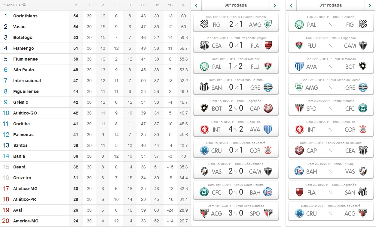 After today’s round, Palmeiras are found at 12th position with 41 points. With eight rounds to go, Palmeiras are nine points from the last Libertadores spot: practically unreachable. More importantly, Palmeiras are still eleven points from the first relegation spot: also that should be unreachable, thank you very much. Palmeiras need a few more wins before we all can shift our focus to the assembly of a competetive squad for 2012.