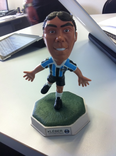 Grêmio paid Palmeiras roughly US$ 2.8 million for a 50% share in the player (the other 50% belong to Cruzeiro), which must be considered reasonable – for Palmeiras, that is. My smile grew even bigger when I saw the ridiculous little doll in blue and white stripes. Poor gremistas… I give them six months: K30 will be out the back door faster than you can say “traitor”.