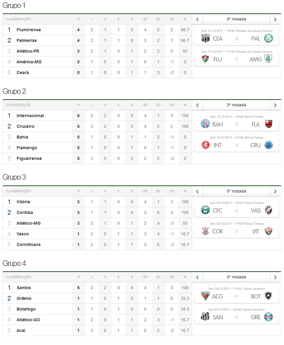 The Brazilian Sub-20 championship is under way. The format of the competition is four groups with five teams in each, where the top two in each group advance to the quarter-finals. Palmeiras play in group 1 and currently ties for first position with Fluminense. The Verdão beat Atlético Paranaense 1-2 in the opening game and yesterday drew 1-1 with Fluminense. Check out the full tables to your right (source: globo.com).