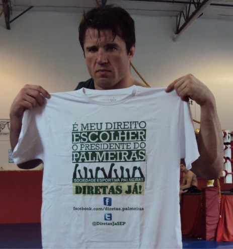 It takes a Sonnen to complete the sonar pings… The always polemic MMA fighter received a visit from palmeirense Paulo Zago who was passing by on a business trip and grasped the opportunity to ask Sonnen to pose with the campaign t-shirt from the “Direct Elections Now” campaign. “I have the right to choose Palmeiras’ President” the t-shirt reads, as Sonnen joins the ranks of Minister of Sports Aldo Rebelo and world famous neuroscientist Miguel Nicolelis asking for a bit of democracy at Palmeiras.