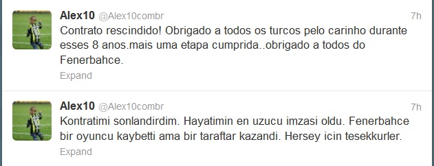 “Contract Revoked! Thank you all Turks for your affection during these 8 years. One more phase concluded. Thank you, everyone at Fenerbahçe” read the message posted in Portuguese. And in Turkish: “I have ended my contract. It was the saddest signature of my life. Fenerbahçe has lost a player, but has won a supporter. Thanks for everything.” The lines signal the exit of one of the greatest Fenerbahçe idols of all times: club captain since 2007, Alex played a total of 325 games and scored 164 times for Fener, winning three National Championships, two Turkish Super Cups and one National Cup. He leaves the club only weeks after having received a statue in his honour.