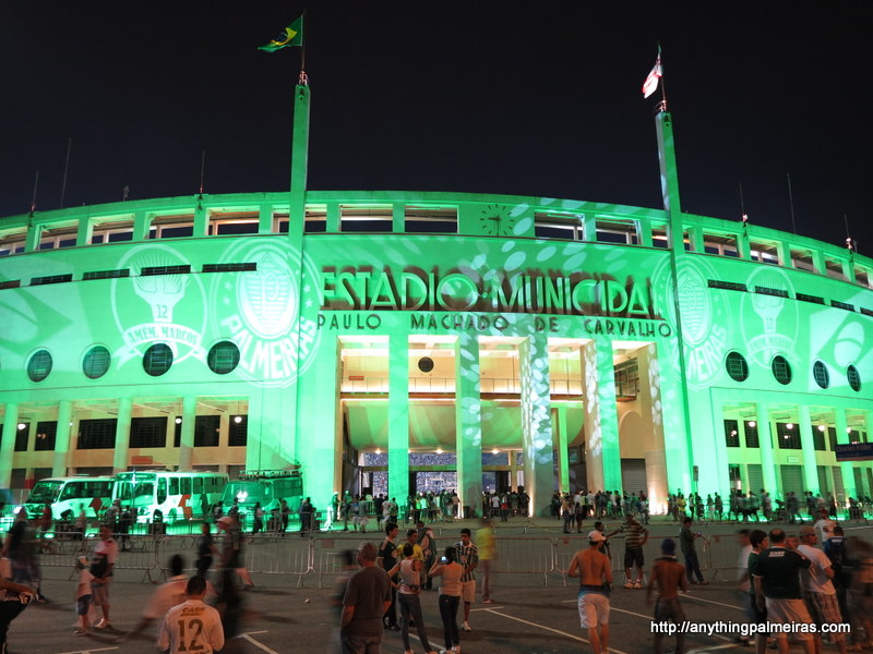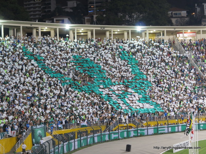 The atmosphere is that of serenity, pride, a fair bit of melancholy but also of celebration. As the spectators slowly fill up the Pacaembu hours before kickoff – briefly stopping outside to admire the green floodlights and tributes to “the Saint” and the immortal #12 displayed on the facade of the stadium – they joyfully make use of balloons and mosaics while singing practically nonstop.