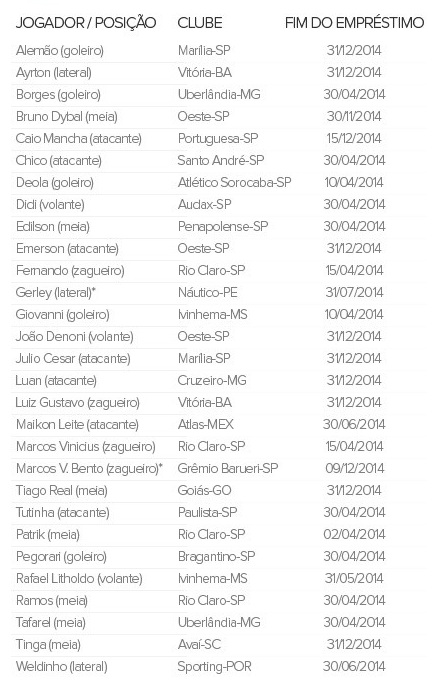 outsourced27 Palmeiras players are currently not at the Academia, but instead rendering service at other teams. It’s a rather hefty number, but the Nobre administration’s philosophy is that these players are better of playing frequently than only training. It’s a mix of young and not so young players. Some are expected to sooner or later return to Palmeiras in condition to enter the A squad – as did Wellington. Others didn’t do too well in the Palmeiras jersey last year but are still on a contract; Maikon Leite is a good example of a player who we’re unlikely to see ever again flying our colours. Check out the complete list of outsourced players to your right (athlete’s name and position, where he’s at and until when; the * indicating that his contract ends at the same time as the end of his loan period).