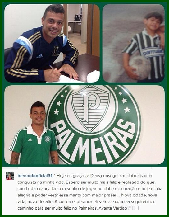 Yesterday, offensive midfielder Bernardo signed a contract with Palmeiras until the end of the year. A bit of a problem child in regard to his private life and unable to maitain regularity at Vasco da Gama, he’s been given a second chance at Palmeiras. It’s obviously a risky move, but could pay off hugely if he grabs the opportunity. Who knows some fresh (?) air in a new city does wonders for Bernardo; that and the fact that he’s now both player and supporter, as the instagram picture he published yesterday indicates.
