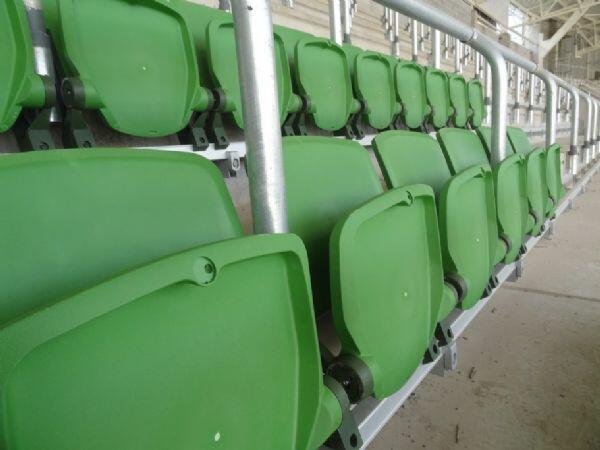 At the Allianz Parque, a first batch of chairs have been mounted on the metallic rails, Wembley-style. By not bolting the chairs to the ground, more space is freed up and it’s easier to clean the floor. On the picture you see a simple version: other sectors while have chairs with arm rests, some will have stuffed seats. All chairs will be fire proof.