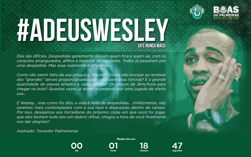 In less than an hour, Wesley’s contract with Palmeiras expires. As the clock strikes midnight, the Verdão can finally leave one of the club’s greatest acquisition fiascos behind. Both player and São Paulo F.C. deny it, but Wesley is joining Kardec over at the enemy’s . Good for him. And potentially good for Palmeiras, if Wesley only creates half as much trouble over there as he did at Palmeiras.