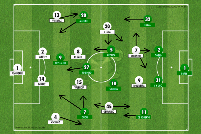 Again, the prospect was unsuccessful, mainly because of Dudu and Allione. As wingers, they have to protect the left and right backs (as they did not against Santos) and, with the ball, they have to create space by using the flanks and then turn inwards, creating the famous numerical superiority.