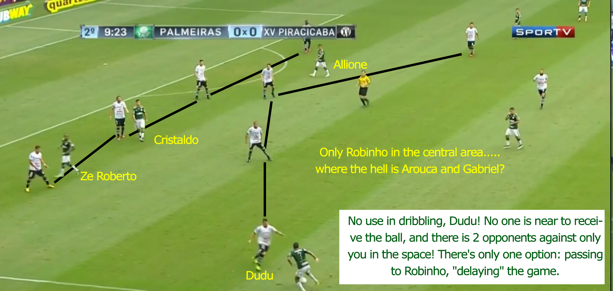 But our #20 and specially our #7 were not so interested in doing this. Instead, they chose the wrong option when playing small clubs: dribbling in the midfield. Look at the image: there is no use in dribbling Dudu’s marker, because there is another man right by his side, protecting the space. This led to 80 minutes of possession and no shots. Only Gabriel, after a corner, saved the game.