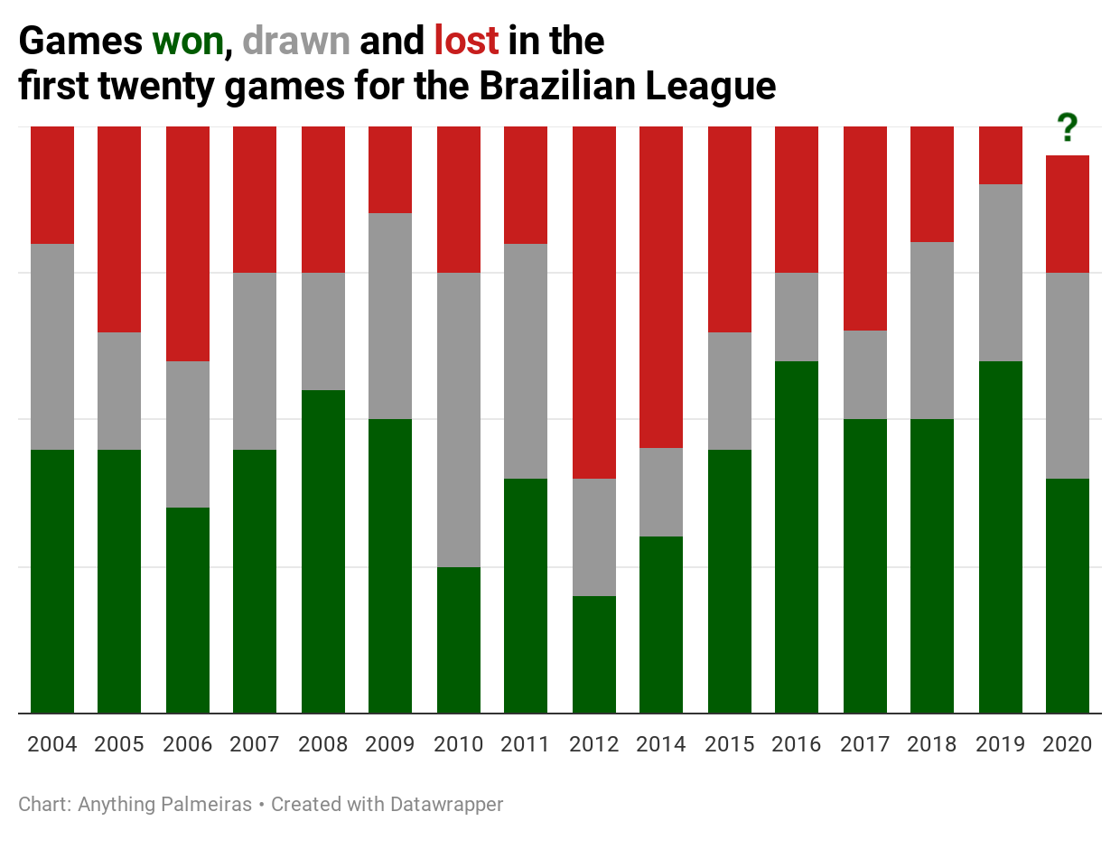 A defeat against Fluminense would make this year’s campaign the worst start since the “reboot” Palmeiras experienced in 2015. A victory would take the team to 34 points, still behind the title campaigns of 2016 and 2018. When compared to the previous 15 seasons, a victory against Fluminense would make it the sixth best, while a defeat would push it down four positions, to tenth, tied with 2015 and 2005.