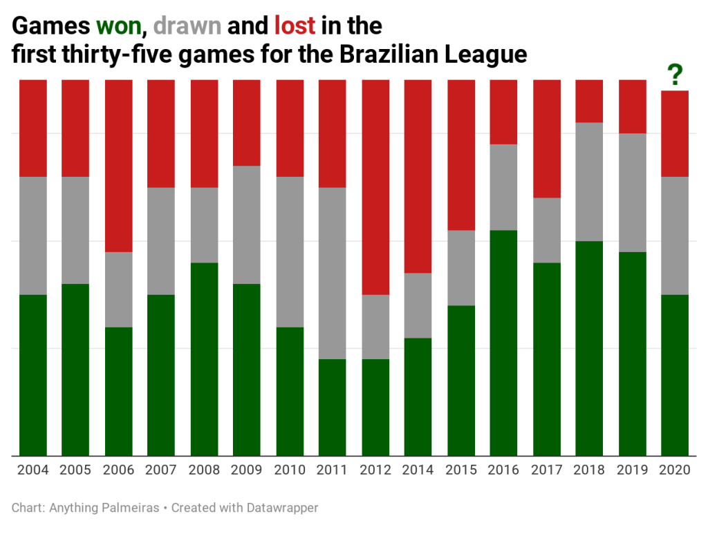 Currently, Palmeiras’ Brasileirão campaign is the worst since 2016. A victory against Coritiba would take the team to 59 points, one short of the 2017 campaign, where we had 60 points in the 35th round.