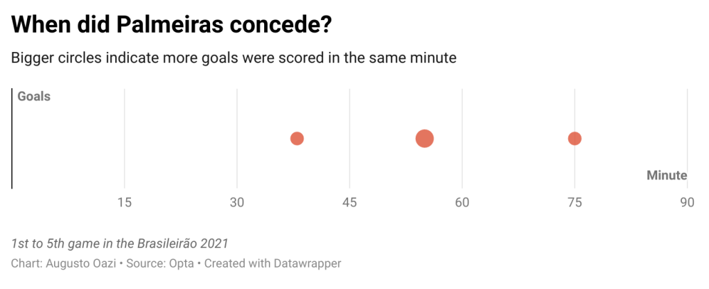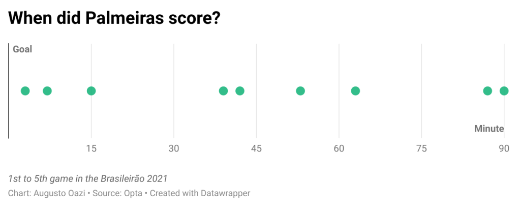 Palmeiras have scored nine goals and conceded four in the Brasileirão 2021. One third of Palmeiras’ goals were scored in the first 15 minutes of game. The only game Palmeiras didn’t score was in the first round against Flamengo and the only clean sheet until now was against Juventude.