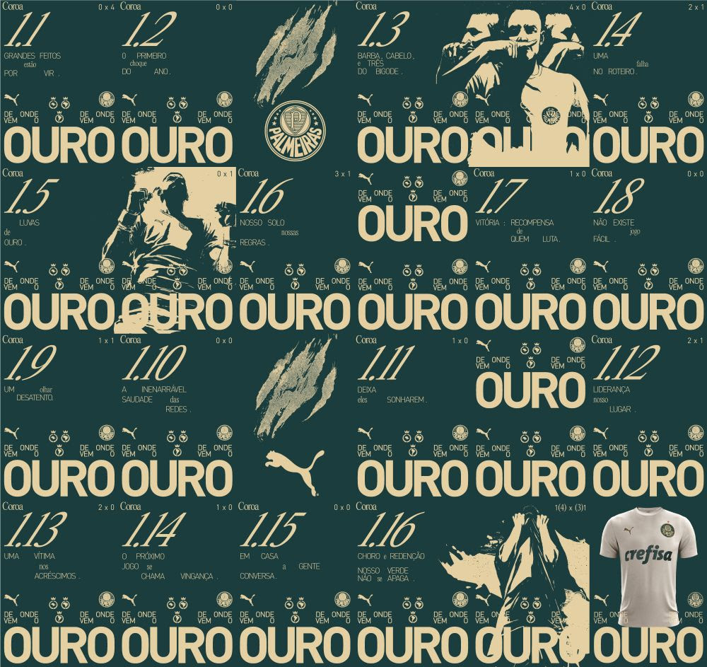 At the Allianz Parque, the new THIRD jersey will be on display in PALMEIRAS’ TROPHY ROOM, to be inaugurated tomorrow, August 26, on the club’s 107th anniversary. All 37 pieces of art of the “From Where the Gold Come” campaign will also be on display in the trophy room, placed in chronological order.