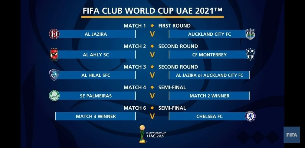 This Monday morning, in Zurich, Switzerland, FIFA conducted the draw of the matches of the Club World Cup, scheduled for the period February 3rd to 12th 2022, in the United Arab Emirates. Palmeiras will face Al Ahly, from Egypt, or Monterrey, from Mexico, in the semi-finals. Above, the tournament bracket.